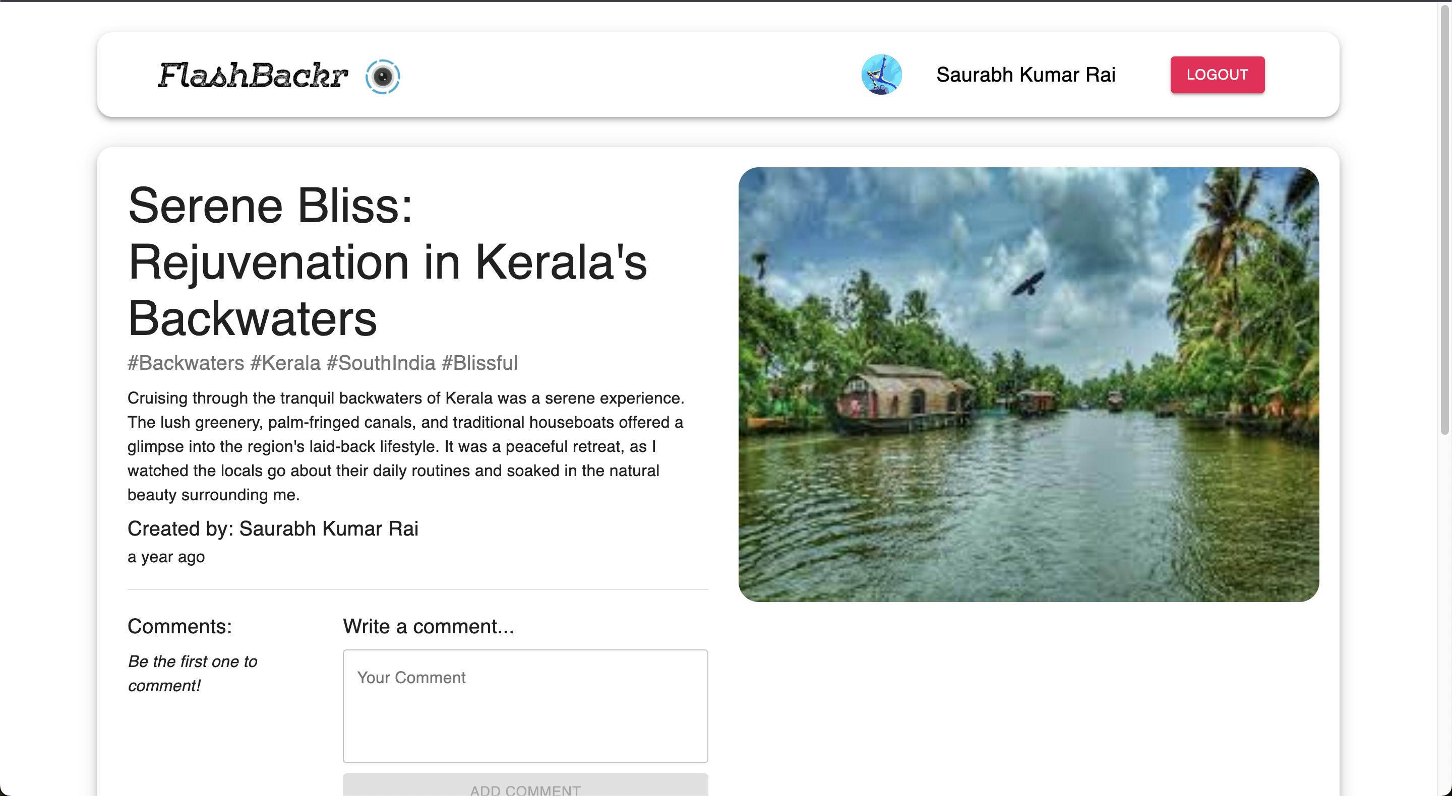 User interaction is central to FlashBackr, featuring the ability to like and comment on posts. This functionality not only enhances engagement but fosters a sense of community, where users can connect and engage with each other’s experiences. Pagination and efficient routing ensure seamless navigation across the platform, enhancing user experience even as content scales.